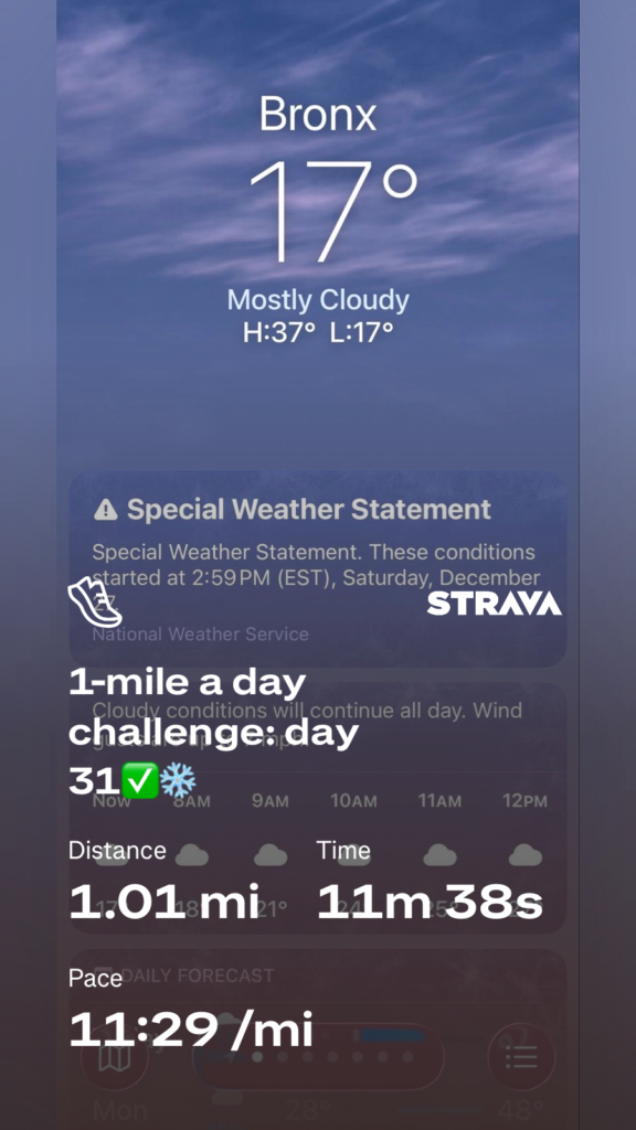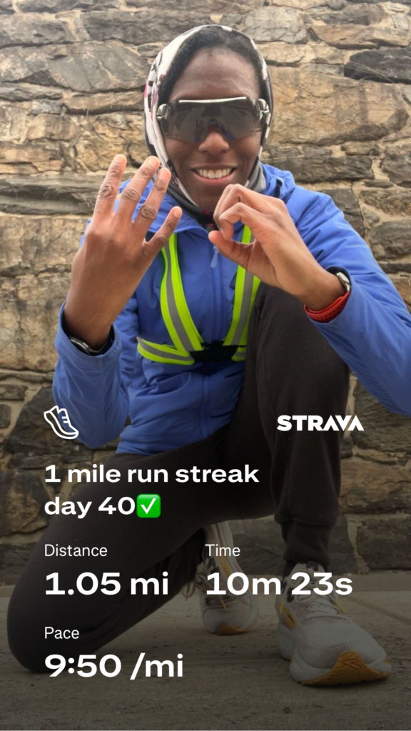 I finished running a mile a day for 50 straight days. That’s 50 miles total. I didn’t actually intend to go that long; it was only supposed to be a one-week challenge. But after those first seven days, I challenged myself to just keep moving—and that’s exactly what I did. I ran through rain, snow, and the frigid cold. I ran in the dark before work and even hopped on a treadmill once, though every other mile was done outdoors.